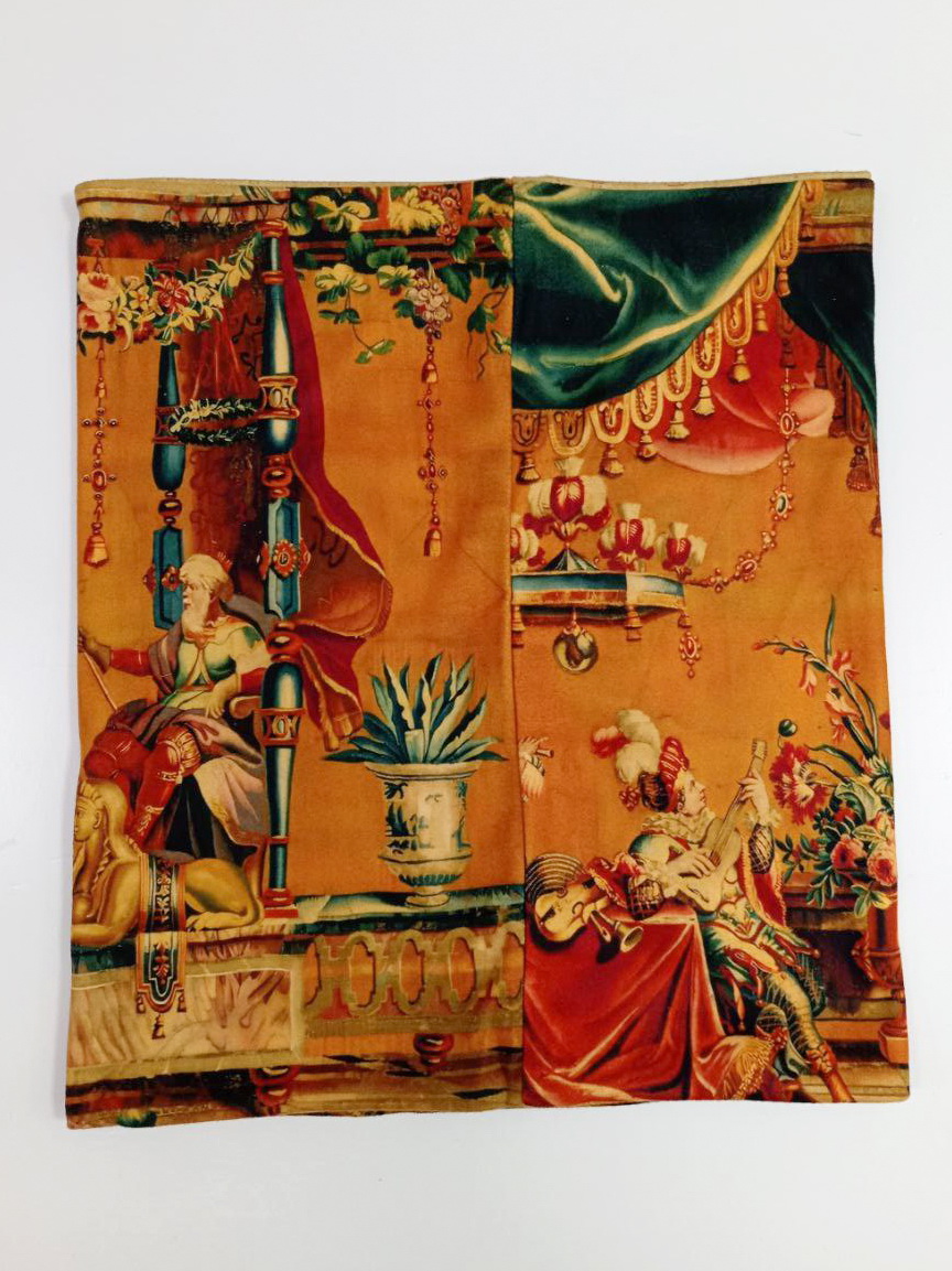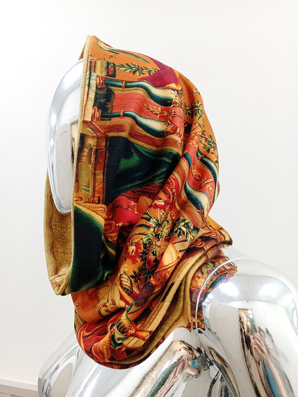 На снуд нанесен принт, созданный по мотивам шпалеры 17 века, Фландрия.